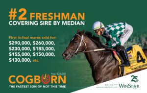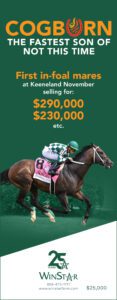 The fastest G1 winning sprinter in the world in 2024, Cogburn is by the outstanding young sire, Not This Time. Not This Time has enjoyed tremendous success with the Awesome Again branch of Deputy Minister. He has a Champion out of a mare by Ghostzapper, a G1W out of a mare by Wilko, and a millionaire out of a mare by Awesome Again himself. This also suggests mares by Paynter and Oxbow. Deputy Minister is a Northern Dancer line horse, and Not This Time already has two BTWs from the Sadler’s Wells branch through Medaglia d‘Oro (sire of Violence and Warrior’s Reward) and Paddy O’Prado, both sons of El Prado. Not This Time has a G1W out of a mare by Speightstown (sire of Munnings) from the Gone West line. From this line, Not This Time also has a BTW out of a mare by a son of Mr. Greeley, suggesting Elusive Quality (sire of Quality Road), Grand Slam and Proud Citizen. Not This Time has GSWs out of mares by Candy Ride from the Fappiano line. On the cross with Fappiano line mares, there is a G2W out of a mare by Unbridled son, Empire Maker, and a BTW out of a mare by his son Pioneerof the Nile (sire of American Pharoah, Cairo Prince and Classic Empire). There has also been success for this cross through mares by Midnight Lute and Broken Vow, and there is GSW from a mare by Unbridled’s Song, sire of Not This Time’s half-brother Liam’s Map. From other branches of Mr. Prospector there is a GSW from a mare by Smart Strike (sire of Curlin, Lookin At Lucky and English Channel), and BTWs out of mares by Street Sense and Street Hero (both by Street Cry) and City Zip. There are five BTWs from A.P. Indy line mares, including a G1W out of a mare by Pulpit, a GSW out of a mare by Tapit, and BTWs from mares by A.P. Indy, Friends Lake and Mineshaft (bred on the same cross as Malibu Moon, Flatter and Congrats).