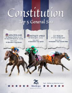 2025 racing: MINDFRAME, winner of the Stephen Foster S. (G1), Churchill Downs S. (G1) and Gulfstream Park Mile S. (G2); PIN UP BETTY, winner of the Mint Julep S. (G3) and Anchorage Overnight S. and second in the Churchill Distaff Turf Mile (G2); PATRIOT SPIRIT, winner of the Vosburgh S. (G3) and $103,000 Reigh Count S.; PARCHMENT PARTY, winner of the Belmont Gold Cup S. (G3) and $150,000 Birdstone S.; SPAZZATURA, winner of the Gran Premio Hipodromo Chile (CHI-G1); MEDJOOL, winner of the Clasico Verano Arturo Cousiño Lyon, (CHI-G2) and Clasico Otoño (CHI-G2) and second in the Clasico Club Hipico de Santiago (CHI-G1); JOHN HANCOCK, winner of the $200,000 Sam F. Davis S.; ADMIRAL DENNIS, 3 1/4-length winner of the $200,000 Delaware Derby and third in the $300,000 Ellis Park Derby; IMPLEMENTATION, winner of the $165,000 Army Mule S. and Smile Sprint S.; CHASING LIBERTY, winner of the $100,000 Bob Bork Texas Turf Mile S., second in the $150,000 Caesars H., and third in the $100,000 Black Gold S. and $150,000 Dade Park Dash S.; NINETEENAMENDMENT, winner of the $100,000 Dahlia S.; SURVEILLANCE, winner of the $100,000 David M. Vance S., second in the Tom Fool S. (G2) and third in the John A. Nerud S. (G3); MEDICINE DOG, winner of the Golden Boy S.; La Wally, second in the Oak Leaf S. (G2) and third in the Del Mar Debutante (G1); etc.