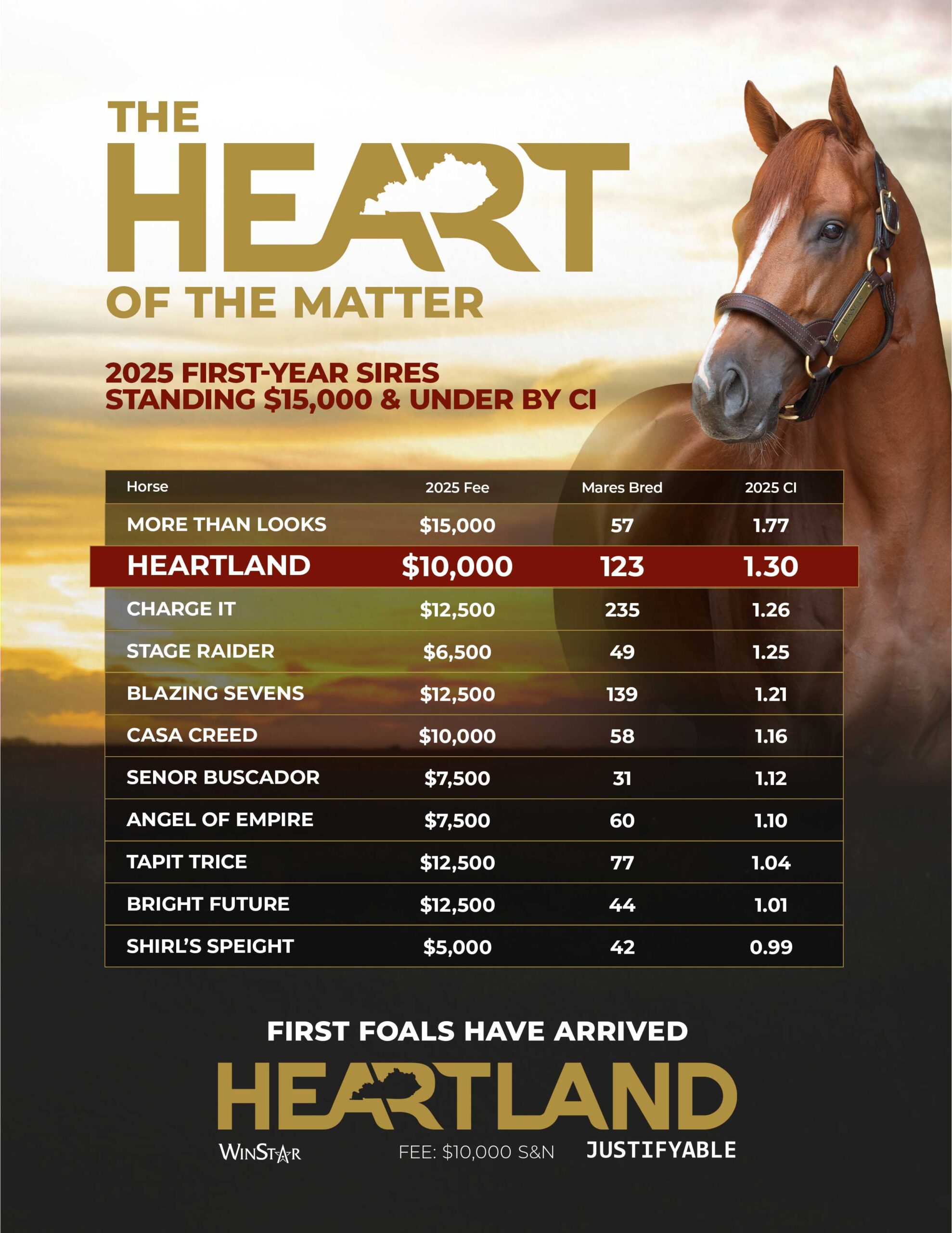 - 1.30 CI – #2 among first year sires who stood for $15,000 and under