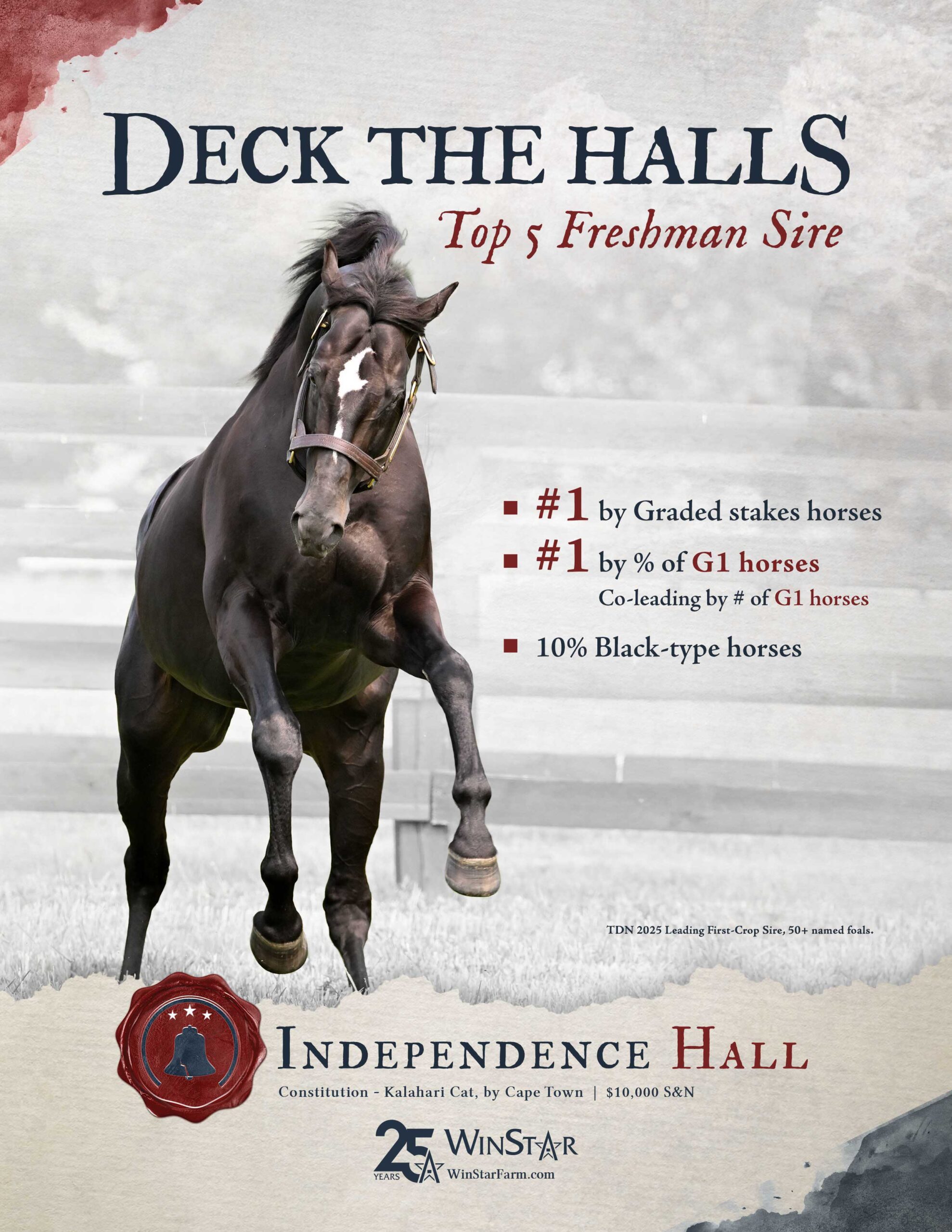 - First crop in 2025 includes CTBA Lassie S. winner SHE’S NEVER WRONG; Del Mar Futurity (G1) third Civil Liberty, Northern Lights Futurity third and Canterbury Park MdSpWt winner Perfect Gamble, 2-length Saratoga MdSpWt and 1 1/4 length Delaware Park AOC winner and $200,000 Maid of the Mist S., third Victory Hall, $100,000 Best of Ohio John W. Galbreath S. third Sweet Kylie, 6 1/2-length Delaware Park MdSpWt winner Freely Held, 6-length Presque Isle winner Aye Bay Bay, 5 3/4-length Parx MdSpWt winner Coppedge, 3-length Evangeline Downs MdSpWt winner Runforjustice, 2 1/4-length Prairie Meadows winner Summers With Sonya, Keeneland MdSpWt winner Sleepingonfreedom, Woodbine MdSpWt winner Katie’s Grace, Charles Town MdSpWt winner Napule, etc.