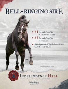 Independence Hall is open to cross with most of the strains that have worked under his sire. His second dam is a sister to the brilliant Breezy Story, a daughter of Storm Cat. This strain will be back in the 4th generation of his offspring, and we can note that Constitution is already sire of 10 BTWs out of Storm Cat line mares, 4 G1. Successful broodmare sires include Giant’s Causeway, his brother Freud and son, First Samurai; Bluegrass Cat; Scat Daddy; Stormin Fever; and Harlan’s Holiday (sire of Into Mischief). Storm Cat is a Northern Dancer line horse, and from other branches of that line, Constitution has a GSW out of a mare by Dixie Union; a GSW out of a mare by Ghostzapper (by Awesome Again, from the Deputy Minister branch); and from the Sadler’s Wells branch, G1Ws out of mares by Galileo and Kitten’s Joy (by El Prado, also sire of Medaglia d’Oro). Looking at the Mr. Prospector line, Constitution has done very well with the Fappiano branch. He has GSWs out of mares by Empire Maker, and a BTW out of that horse’s son, Pioneerof the Nile, suggesting daughters of such as American Pharoah and Cairo Prince. There are also 3 BTWs out of mares by Unbridled Song, and a BTW out of a mare by Broken Vow. There are 2 BTWs out of mares descending from Mr. Prospector through Gone West, and a GSW out of a mare by Curlin, a son of Smart Strike. We can also note Constitution has already sired no less than 4 BTWs, including classic-winning standout Tiz The Law out of mares by Tiznow, a son of Relaunch. – Alan Porter