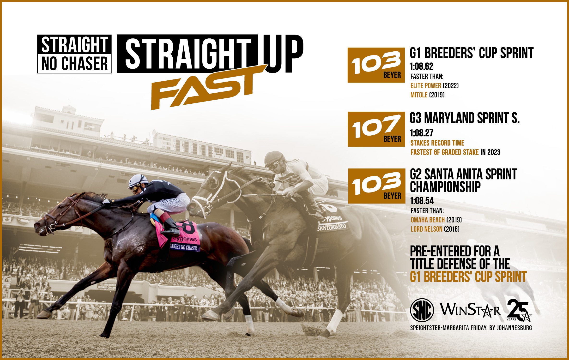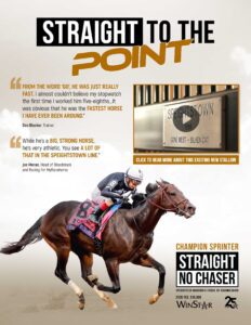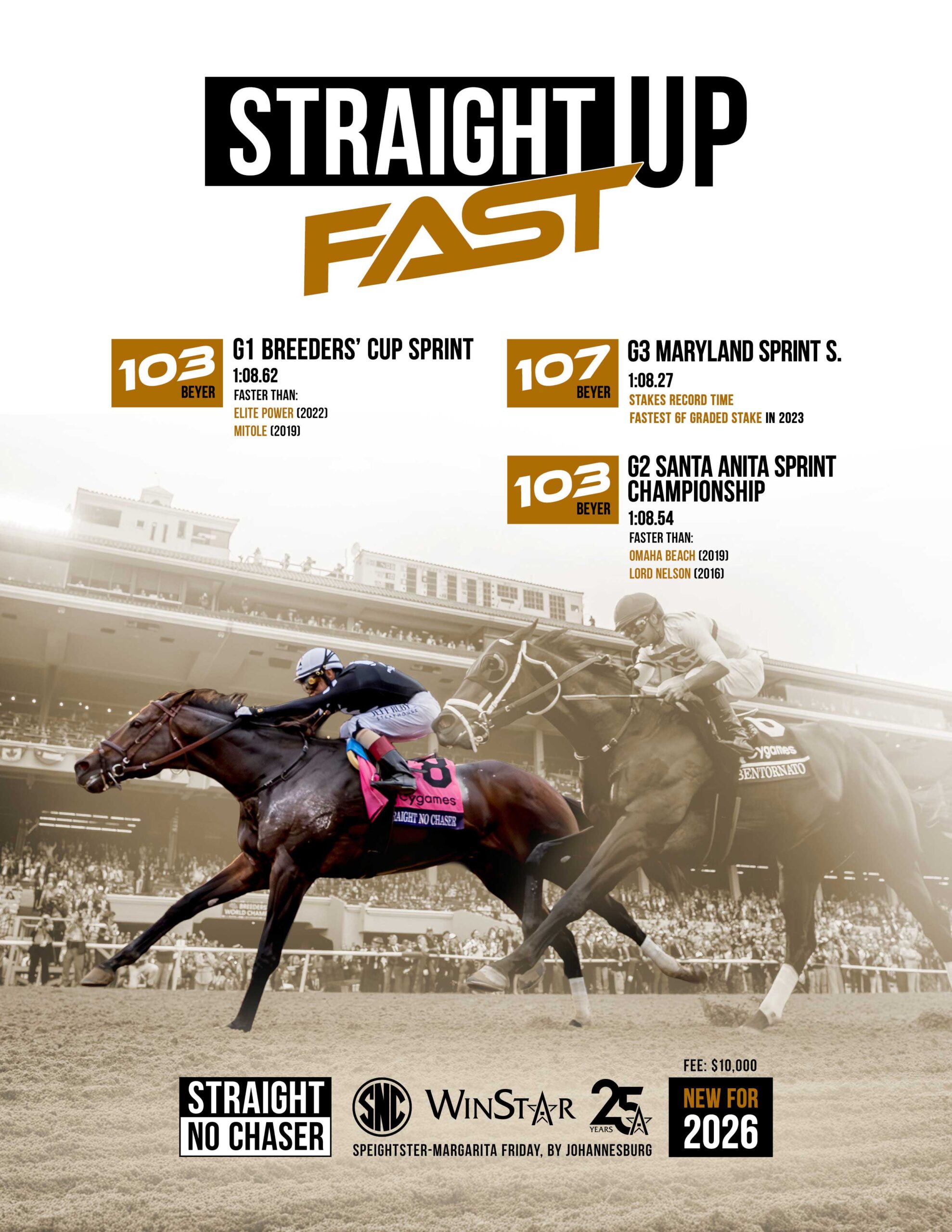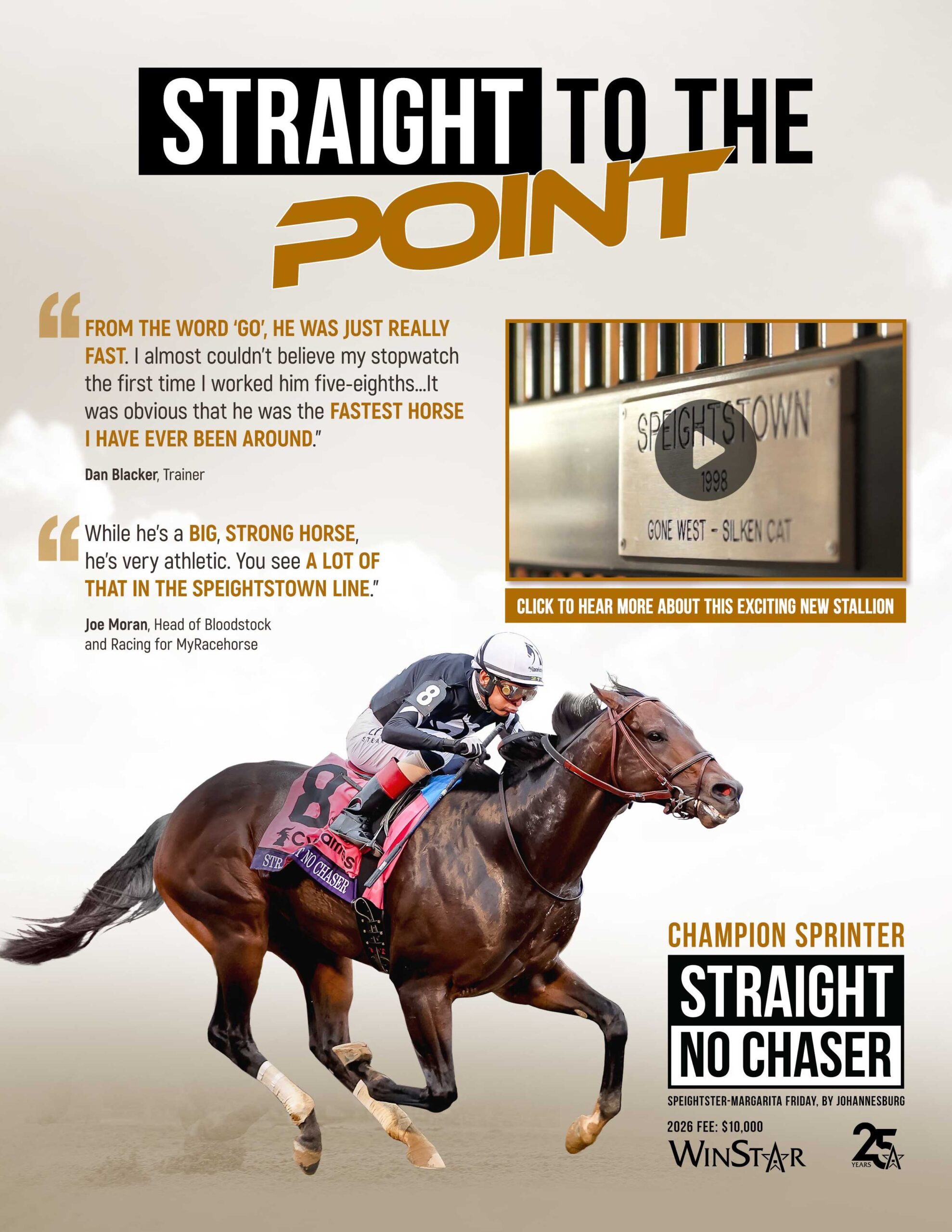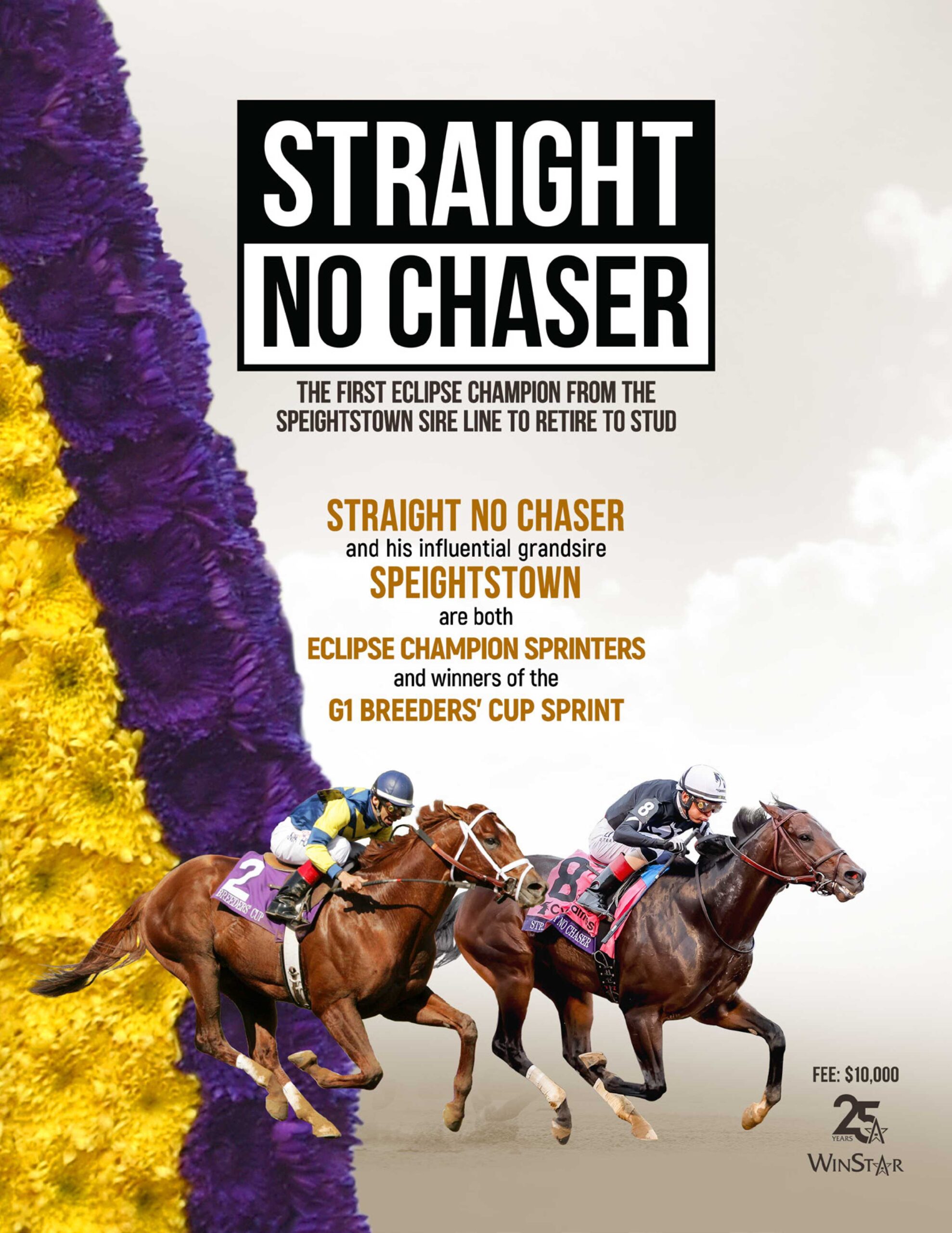 Straight No Chaser is by a talented son of Champion Sprinter and outstanding sire, Speightstown. The cross of Speightstown and sons with Sadler’s Wells has been exceptional, and Straight No Chaser’s sire, Speightster, is no exception with a multiple SW out of a mare by El Prado, three SWs out of mares by Medaglia d’Oro, and a SW of out a mare by Perfect Soul, suggesting mares by other El Prado sons, Kitten’s Joy, Artie Schiller, and Galileo. The cross of Speightstown and sons with Nureyev through Theatrical has also done very well, and Nureyev might be brought in through Unusual Heat, Acclamation, Atticus, Fasliyev, Spinning World or Stravinsky. Speightstown and sons have enjoyed remarkable success with mares from the Danzig branch of Northern Dancer, including G1Ws out of mares by Belong to Me, Danehill, Lost Soldier, Langfuhr, and Orpen; GSWs out of mares by Dayjur, Hard Spun and Honor Grades; and SWs out of mares by Partner’s Hero, War Chant, Exchange Rate and Chief’s Crown. Straight No Chaser is half-brother to a SW by Danzig line stallion, Pomeroy, and mares by War Front and his sons should also work. The Deputy Minister branch of Northern Dancer has done very well under Speightstown, with a G1W out of a mare by Deputy Minister himself, GSWs out of mares by Ghostzapper, Awesome Again, and Salt Lake, and SWs out of mares by Silver Deputy and his sons, and Touch Gold (broodmare sire of a Speightster SW). It could also be worth considering Dehere. Straight No Chaser is out of a mare by Johannesburg, a grandson of Storm Cat, but it will be worth breeding Straight No Chaser back over Storm Cat line mares. On that cross, Speightster has a SW out of a Bluegrass Cat mare. Speightstown has a G1W out of a mare by Menifee, a son of Harlan. From the same branch, there are also two GSWs out of mares by Harlan’s Holiday (sire of Into Mischief). There are two GSWs and a SW out of mares by Giant’s Causeway and his sons, a GSW out of a Freud mare, and two SWs out of mares by After Market. There are also Speightstown line GSWs out of mares by Shamardal, Tabasco Cat, Stormy Atlantic, and SWs out of mares by Bedford Falls, Shackleford and Discreet Cat (all by Forestry). There are more than 30 SWs on a cross with A.P. Indy line mares. In addition to those out of A.P. Indy himself, there are GSWs out of mares by Bernardini, and SWs out of mares by Malibu Moon, Flatter, Congrats, Majestic Warrior, Jump Start, Dance With Ravens (broodmare sire of a Speightster SW) and Pulpit. There have also been 8 SWs with mares by Tapit. Speightstown and sons have done very well with Caro line mares. From the Cozzene branch, there is a G1W out of a mare by Cozzene, and SWs out of mares by Mizzen Mast and Alphabet Soup. From the Indian Charlie branch, there is a G1W out of a mare by Indian Charlie, and a G1W out of a mare by Uncle Mo. Speightstown and sons have done well with the Fappiano branch of Mr. Prospector, with Speightster having a SW out of a mare by Quiet American (also broodmare sire of a Speightstown G1W) and a SW out of a mare by Half Ours (also broodmare sire of a Speightstown line G1W). There are three SWs out of mares by Unbridled’s Song. Speightstown has also enjoyed success with mares from the Relaunch line, including Honour and Glory, Put It Back, and Tiznow (broodmare sire of a Speightster SW). There are five SWs on a Speightstown cross with mares by More Than Ready, six SWs with mares by Holy Bull and his sons, Macho Uno and Flashy Bull, and four out of mares by Maria’s Mon. – Alan Porter