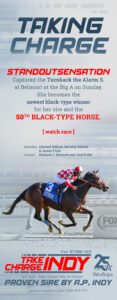 - 2025 runners include Monomoy Girl Overnight S. winner, Martha Washington S. winner and Ashland S. (G1) second TAKE CHARGE MILADY; Heavenly Prize Invitational S. and Critical Eye S. winner and Empire Distaff second BERNIETAKESCHARGE; $150,000 Turnback the Alarm S. winner STANDOUTSENSATION; TAKE CHARGE BABY, winner of the Orphan Kist S.; INDY BAY, winner of the Charles Town Oaks (G2) and the Jersey Girl S. and third in the Victory Ride S. (G3); Montalcino, second in the Commonwealth S. (G3); FORTISSIMO, second in the Daryl E. Parker Memorial Tall Stack S., Daniel Stearns Cleveland Gold Cup, and Best of Ohio Green Carpet S. and third in the Best of Ohio Sprint S; King County Express S. second and Gottstein Futurity and W.T.B.O.A. Lads S. third Lead The Charge; $125,000 Jamestown S. third Sometime; etc.