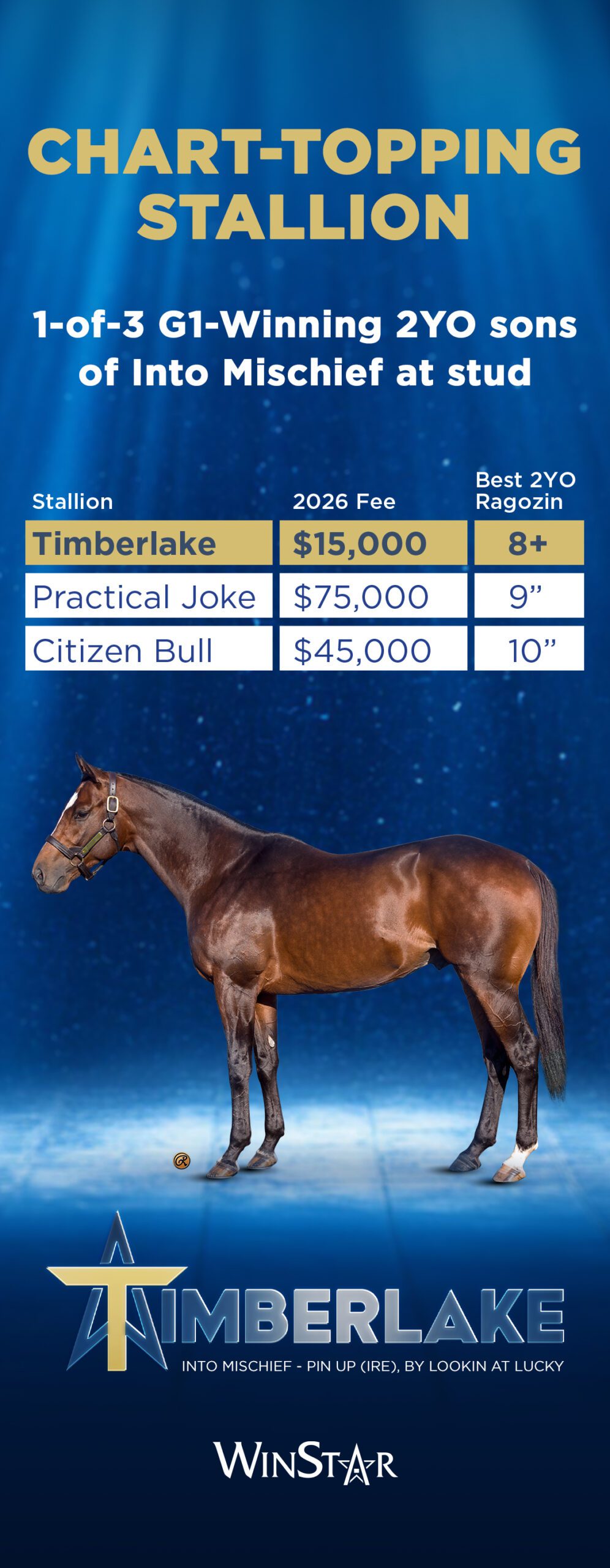 Timberlake is by Into Mischief from a classic family. The Into Mischief cross with mares from the Gone West branch of Mr. Prospector has been extremely successful. The cross with Mr. Greeley supplied a Kentucky Derby and Breeders’ Cup Classic winner; the cross with Speightstown mares is a multiple G1 producing one; and there are GSWs out of mares by Grand Slam and Elusive Quality (notably sire of Quality Road), and BTWs out of mares by Proud Citizen. Into Mischief has sired ten BTWs, including G1Ws, out of mares by Distorted Humor, sire of Maclean’s Music and Jimmy Creed. The cross with mares from the Fappiano branch of Mr. Prospector has done well, including a Champion out of a mare by Unbridled, a Kentucky Derby winner out of a mare by Empire Maker (sire of Pioneerof the Nile and grandsire of American Pharoah, Cairo Prince and Classic Empire) and a G1W out of a mare by Unbridled’s Song. There is also a G1W from a mare by Quiet American. From the Cryptoclearance branch there is an emerging cross with mares by Candy Ride. Timberlake is out of a mare by Lookin At Lucky from the Smart Strike branch of Mr. Prospector, but crossing back over that line through Curlin might work well. From the Northern Dancer line, we might look to the successful cross of mares from the Danzig line, such as Hard Spun and War Front, and the cross with mares by Medaglia d’Oro and sons Violence and Warrior’s Reward. There is an Into Mischief G1W out of an A.P. Indy mare, a G1W out of a mare by Majestic Warrior, GSWs out of mares by A.P. Indy sons Bernardini, Malibu Moon, Pulpit, Mineshaft, Congr