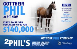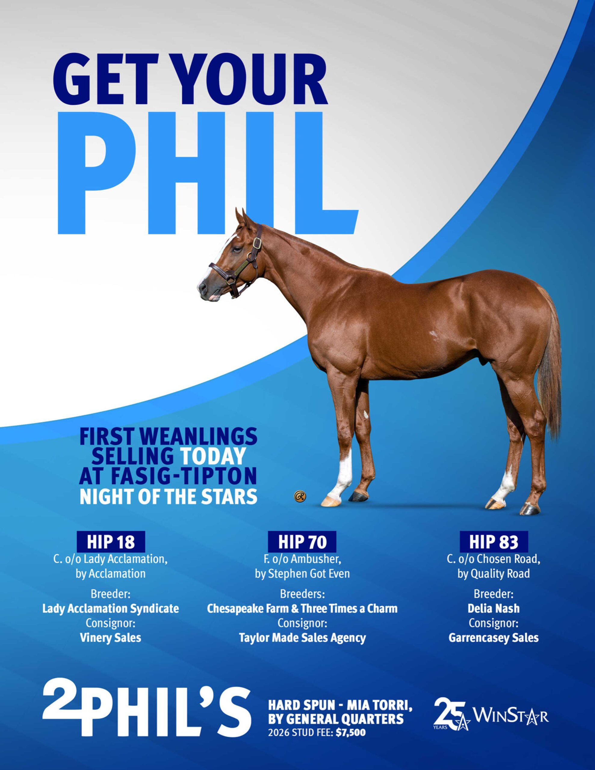 One of the most talented members of his generation, Two Phil’s is by Danzig’s world record-breaking stallion son, Hard Spun, and out of a multiple BTW/multiple Graded-placed sprinter. Hard Spun has crossed well with mares from the Mr. Prospector line. Particularly outstanding has been the Gone West branch through such as by Speightstown, Grand Slam, Mr. Greeley, Elusive Quality, Proud Citizen and Came Home. Hard Spun has also enjoyed exceptional success with the Fappiano branch, including through Quiet American (grandsire of Midnight Lute) and Unbridled, including through Empire Maker and Unbridled’s Song and sons. Looking at other branches of Mr. Prospector, we can note success with Smart Strike, Carson City, Distorted Humor, Fusaichi Pegasus and Kingmambo. Hard Spun has enjoyed success with the Storm Cat branch of Northern Dancer, including via Tactical Cat, Forest Wildcat, Giant’s Causeway and Stormy Atlantic. The cross of Hard Spun and sons with mares from the Sadler’s Wells branch has produced BTWs out of mares by Medaglia d’Oro, Kitten’s Joy and Galileo. A.P. Indy will be back in the fifth generation of Two Phil’s offspring and it would be worth crossing him back over mares from this line, including through Congrats—a brother to Flatter—with other sources including Malibu Moon, Mineshaft and Bernardini. Out of mares from the Roberto line, Hard Spun has GSWs out of mares by Red Ransom and Arch (sire of Blame) and a BTW out of a mare by Dynaformer (sire of Temple City, Point of Entry and Brilliant Speed). Hard Spun also has G1Ws from daughters of Lonhro and Cozzene.