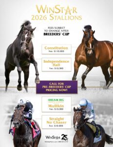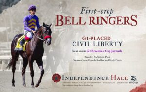 - First crop in 2025 includes CTBA Lassie S. winner SHE’S NEVER WRONG; Del Mar Futurity (G1) third Civil Liberty, Northern Lights Futurity third and Canterbury Park MdSpWt winner Perfect Gamble, 2-length Saratoga MdSpWt and 1 1/4 length Delaware Park AOC winner and $200,000 Maid of the Mist S., third Victory Hall, $100,000 Best of Ohio John W. Galbreath S. third Sweet Kylie, 6 1/2-length Delaware Park MdSpWt winner Freely Held, 6-length Presque Isle winner Aye Bay Bay, 5 3/4-length Parx MdSpWt winner Coppedge, 3-length Evangeline Downs MdSpWt winner Runforjustice, 2 1/4-length Prairie Meadows winner Summers With Sonya, Keeneland MdSpWt winner Sleepingonfreedom, Woodbine MdSpWt winner Katie’s Grace, Charles Town MdSpWt winner Napule, etc.