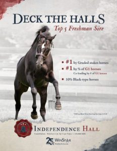 Independence Hall is open to cross with most of the strains that have worked under his sire. His second dam is a sister to the brilliant Breezy Story, a daughter of Storm Cat. This strain will be back in the 4th generation of his offspring, and we can note that Constitution is already sire of 10 BTWs out of Storm Cat line mares, 4 G1. Successful broodmare sires include Giant’s Causeway, his brother Freud and son, First Samurai; Bluegrass Cat; Scat Daddy; Stormin Fever; and Harlan’s Holiday (sire of Into Mischief). Storm Cat is a Northern Dancer line horse, and from other branches of that line, Constitution has a GSW out of a mare by Dixie Union; a GSW out of a mare by Ghostzapper (by Awesome Again, from the Deputy Minister branch); and from the Sadler’s Wells branch, G1Ws out of mares by Galileo and Kitten’s Joy (by El Prado, also sire of Medaglia d’Oro). Looking at the Mr. Prospector line, Constitution has done very well with the Fappiano branch. He has GSWs out of mares by Empire Maker, and a BTW out of that horse’s son, Pioneerof the Nile, suggesting daughters of such as American Pharoah and Cairo Prince. There are also 3 BTWs out of mares by Unbridled Song, and a BTW out of a mare by Broken Vow. There are 2 BTWs out of mares descending from Mr. Prospector through Gone West, and a GSW out of a mare by Curlin, a son of Smart Strike. We can also note Constitution has already sired no less than 4 BTWs, including classic-winning standout Tiz The Law out of mares by Tiznow, a son of Relaunch. – Alan Porter